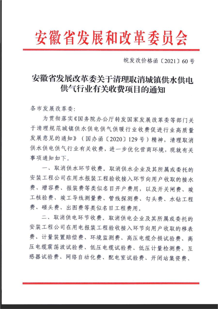 安徽省發(fā)展改革委發(fā)布關(guān)于清理取消城鎮(zhèn)供水供電供氣行業(yè)有關(guān)收費項目的通知》皖發(fā)改價格函【2021】60號