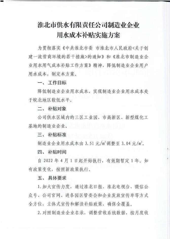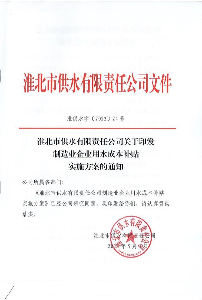 淮北市供水有限責(zé)任公司關(guān)于印發(fā)制造業(yè)企業(yè)用水成本補(bǔ)貼實(shí)施方案的通知 淮供水字【2022】24號(hào)