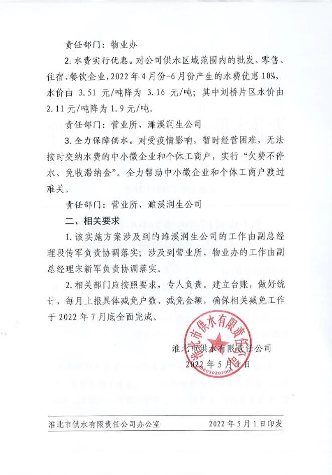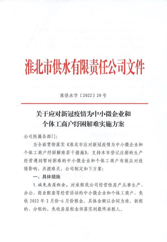淮北市供水有限責任公司關于應對新冠疫情為中小微企業(yè)和個體工商戶紓困解難實施方案 淮供水字【2022】20號