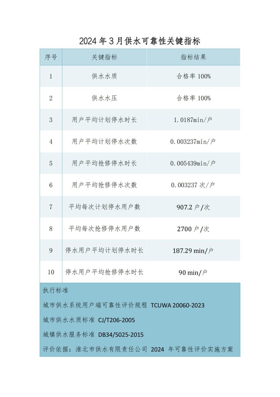 2024年度3月份淮北市供水可靠性關(guān)鍵指標
